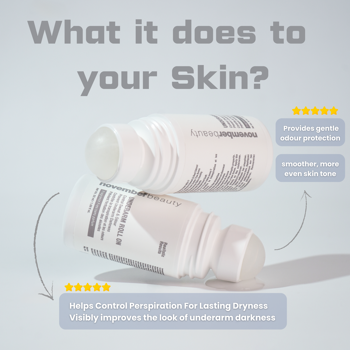 Take control of your day with the November Beauty Underarm Roll-On, designed for those who want all-day dryness and underarms that look smoother and more even-toned.